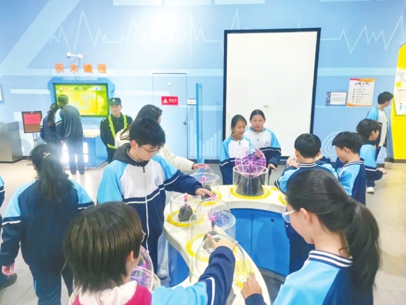 科技馆内,同学们逐一体验AI技术、虚拟现实等前沿技术,让物理课本的抽象原理具象成指尖的趣味实践。